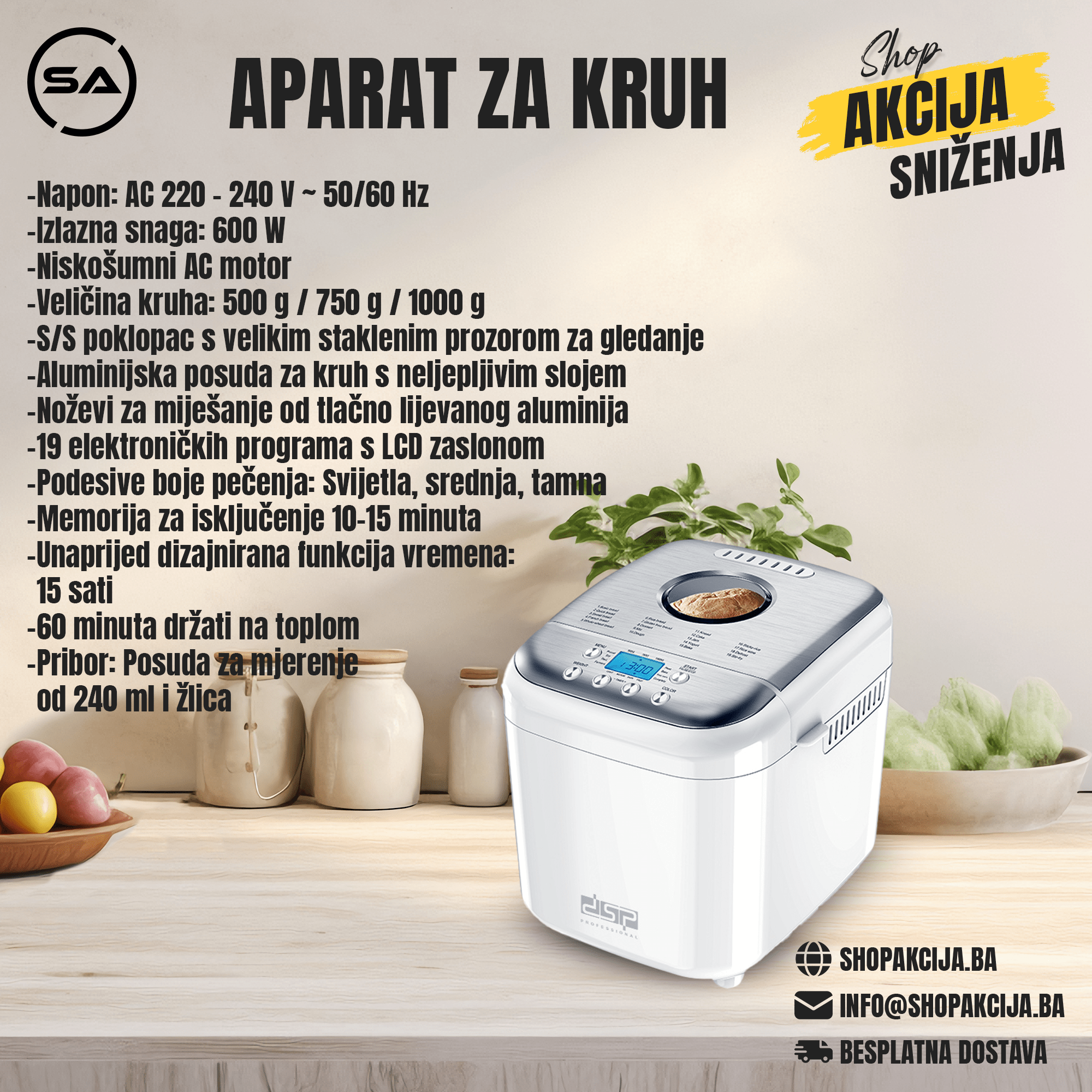 Veličina kruha: 500 g / 750 g / 1000 g
